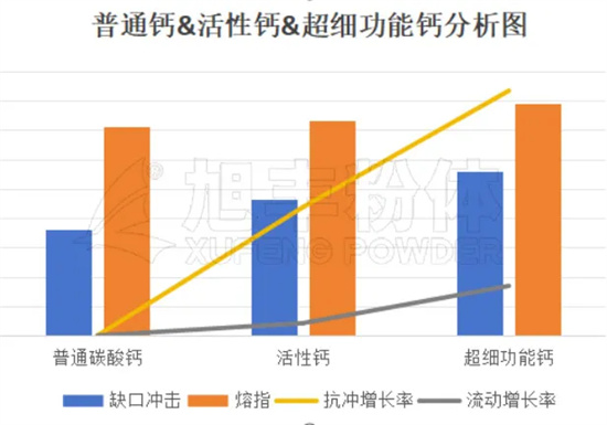以下為經(jīng)過改性后超細(xì)功能碳酸鈣與普通碳酸鈣和活性鈣的力學(xué)性能差異性,超細(xì)功能碳酸鈣在抗沖性能與流動(dòng)性方面相比普通碳酸鈣有明顯優(yōu)勢。在滿足性能的前提下,可減少配方體系中POE添加量,降低配方綜合成本。