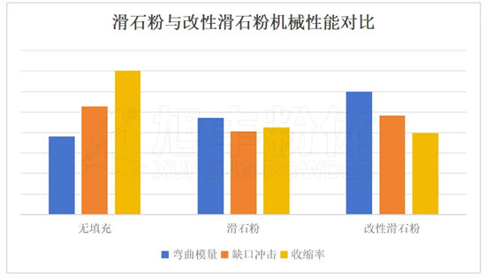 從上圖中可以看出,添加滑石粉后的聚丙烯復(fù)合材料雖然能夠提高彎曲模量,減少收縮率,但沖擊性能下降明顯;而經(jīng)過改性處理后的滑石粉在聚丙烯復(fù)合材料中的沖擊強度、彎曲模量相較于未改性的滑石粉均有較明顯的提升。