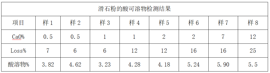滑石粉中酸可溶物雜質成分的種類,測定其中主要游離金屬離子(Ca2+、Fe2+、Fe3+)和代表性有害重金屬元素的含量,主要酸提取物成分有Mg,Al,Ca,Fe的含量?;鬯崽崛∥镏须s質金屬離子在涂料考察,其酸可溶物≤5.0%?;壑兴峥扇芪镞^高時,易使金屬材料生銹。