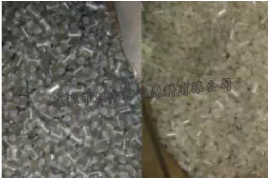 實(shí)驗(yàn)結(jié)果如下圖所示,左邊粒料填充的是滑石粉1,右邊粒料填充的是滑石粉2,實(shí)驗(yàn)結(jié)果表明在滑石粉干白度、細(xì)度等指標(biāo)接近的情況下,滑石粉1色相為冷色系,L值較小,生產(chǎn)的粒料偏暗;滑石粉2色相為暖色系,L值較大,生產(chǎn)的粒料較亮。