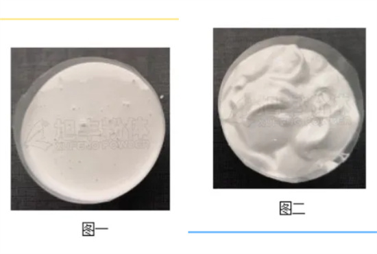 由于(攪拌或搖動(dòng))其粘度即降低的流動(dòng)性質(zhì),稱為觸變性??梢酝ㄟ^粉體表面改性提高涂料體系的觸變值。由于有觸變特性,當(dāng)涂刷較厚時(shí)不會(huì)出現(xiàn)流掛現(xiàn)象,同時(shí)有儲(chǔ)存穩(wěn)定性好等優(yōu)點(diǎn)。(以下為改性前后的數(shù)據(jù)對比,圖一為1250目重鈣,圖二為DXC系列改性粉體)